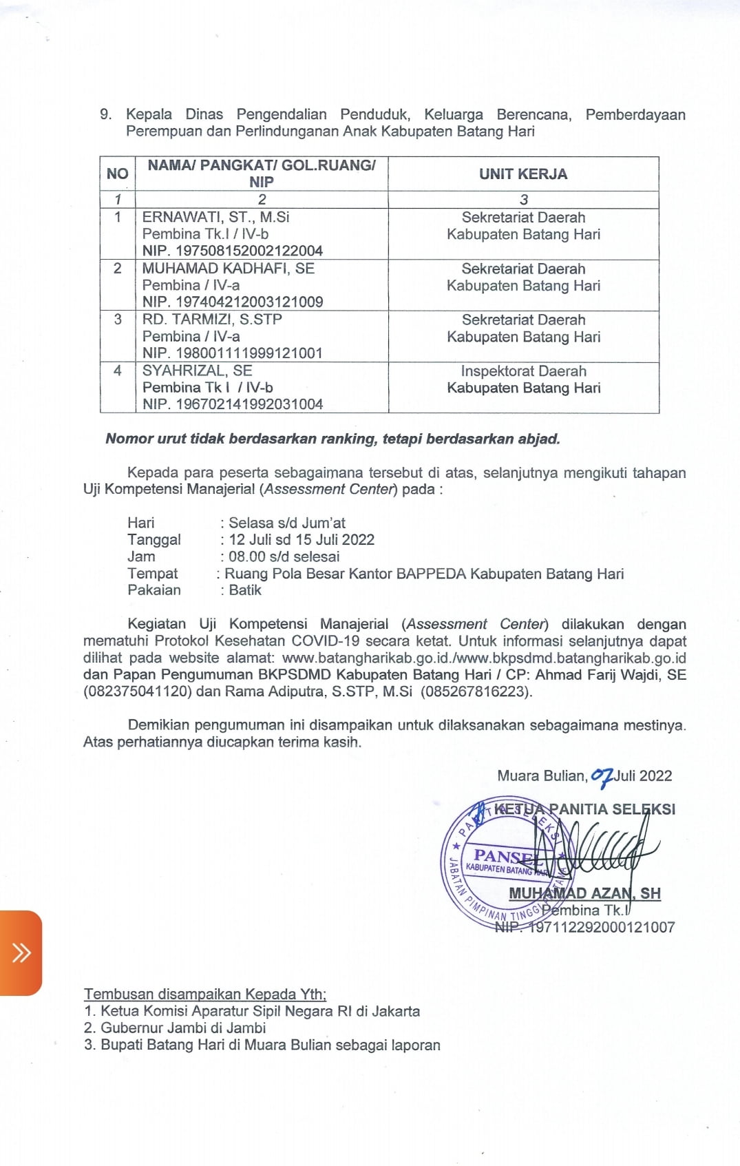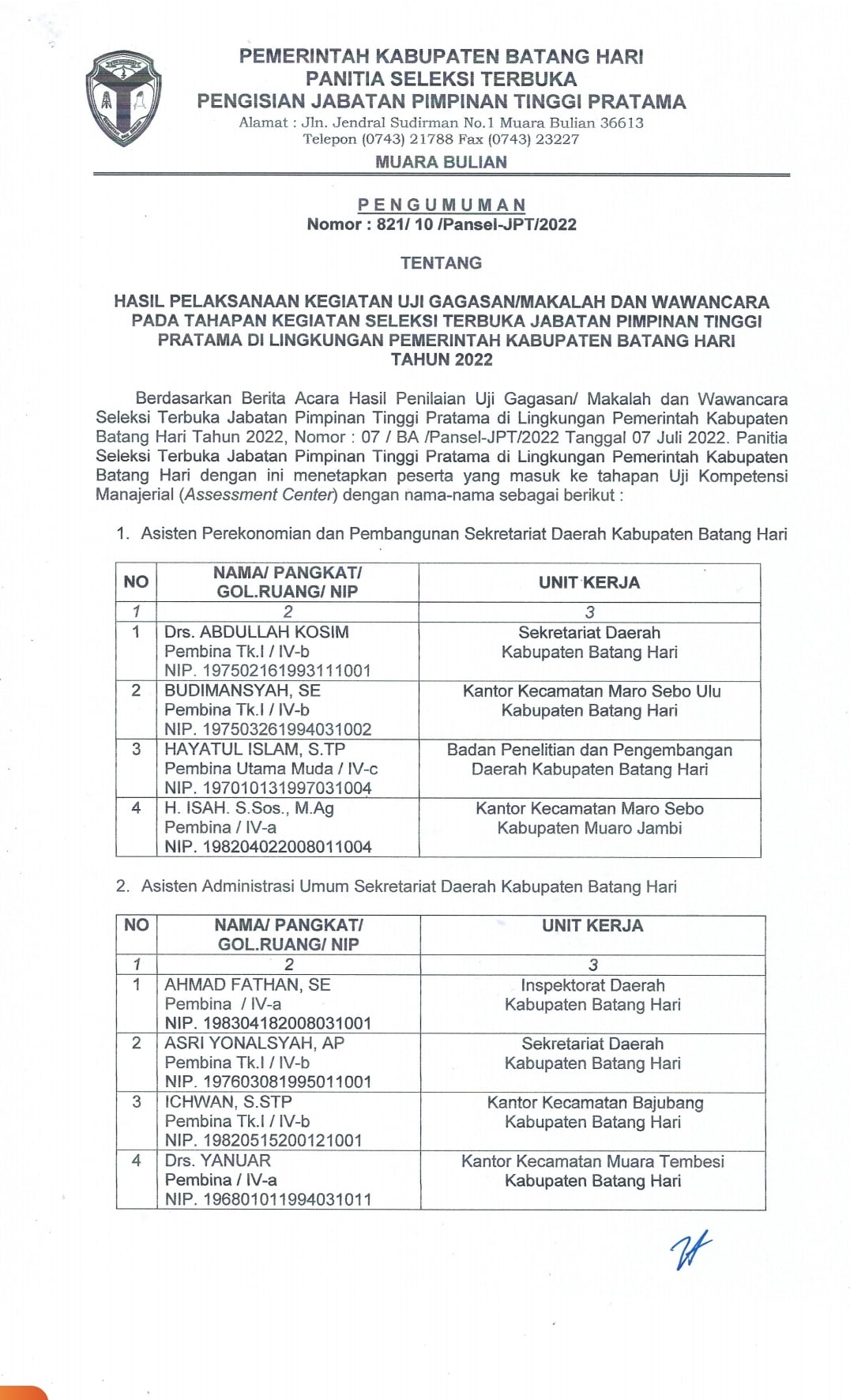 Yang berbunyi, berdasarkan berita acara hasil penilaian ui gagasan /makalah dan wawancara seleksi terbuka jabatan pimpinan tinggi pratama di lingkungan Pemerintah Kabupaten Batanghari tahun 2022, nomor 07/BA/Pansel-JPT/2022 tanggal 07 Juli 2022. Panitia seleksi terbuka jabatan pimpinan tinggi pratama di lingkungan Pemerintah Kabupaten Batanghari dengan ini menetapkan peserta yang masuk tahapan uji kompetensi manajerial (assesment center).