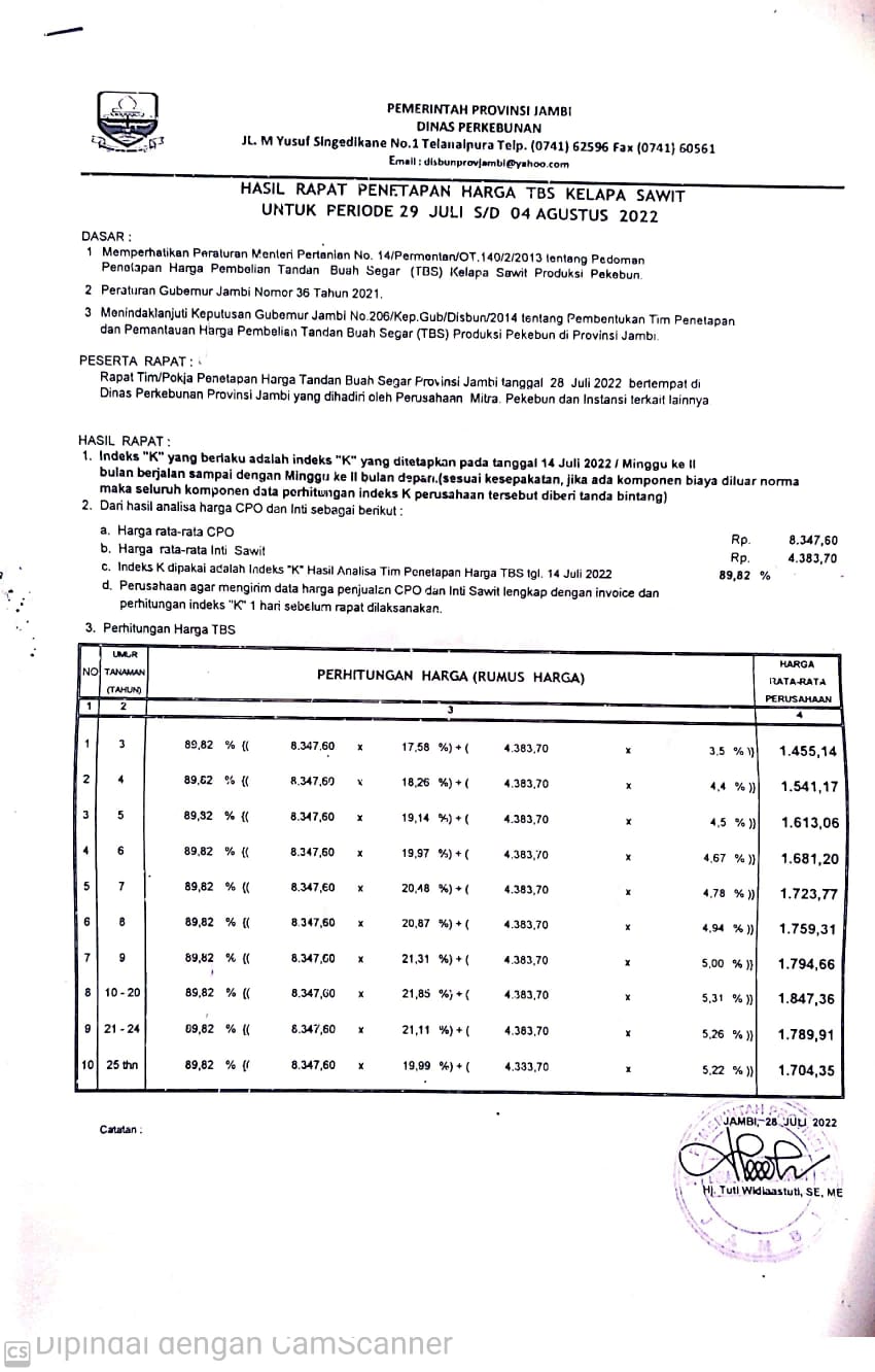 Untuk diketahui, ini adalah harga penetapan hasil rapat resmi Dinas Perkebunan Provinsi Jambi bersama mitra pabrik kelapa sawit (PKS) se-Provinsi Jambi.(uda)